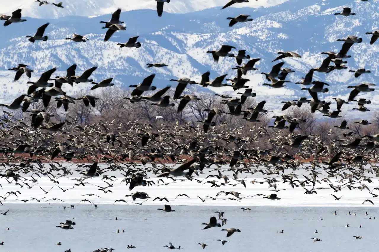 Snow Geese Snow geese have a striking white plumage and are well-known for their loud honking call. These birds migrate in huge numbers as the seasons change in search of nesting and feeding areas. In the winter, flocks of snow geese fly south and often appear as swirling white storms in the skies. Winter habitats for snow geese include southern marshlands in California, Texas and northern Mexico, where they feed on grains, grasses and marsh vegetation. The geese will begin their return northwards to their Arctic breeding grounds once winter is over. This annual cycle has been defining their species for many generations.